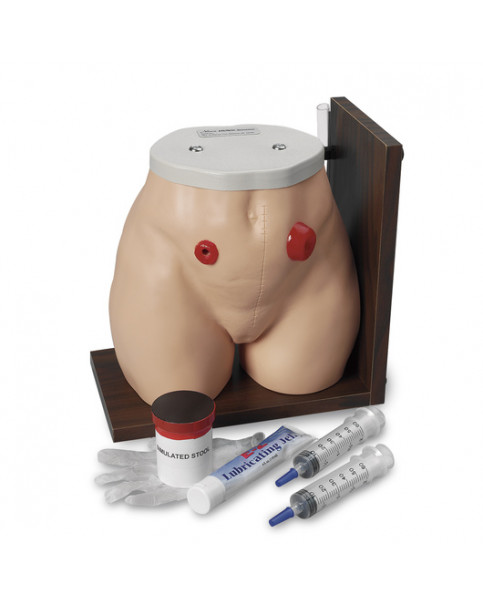 Karnın kopyası kolostomi ve ileostomi anatomisini sergilemektedir. Gerçekçi fonksiyona ve görünüme sahiptir. Stoma dilatasyonu, postoperatif ve kalıcı ostomi torbaları gösterilip uygulanabilir. Kolostomi mümkündür. Şırınga kullanılarak ileostomide (su) ve kolostomide (yapay dışkı) drenaj ve atılım sağlanabilir. Yapay dışkı ve taşıma çantası ile beraberdir.