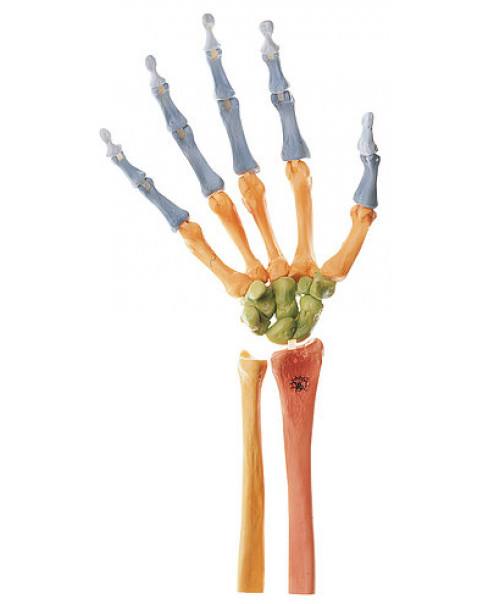 Life-size, made of SOMSO-Plast®, with distal ends of radius and ulna. Model for demonstrating hand movement The individual bones are coloured to assist familiarization with the parts of the hand. In one piece.